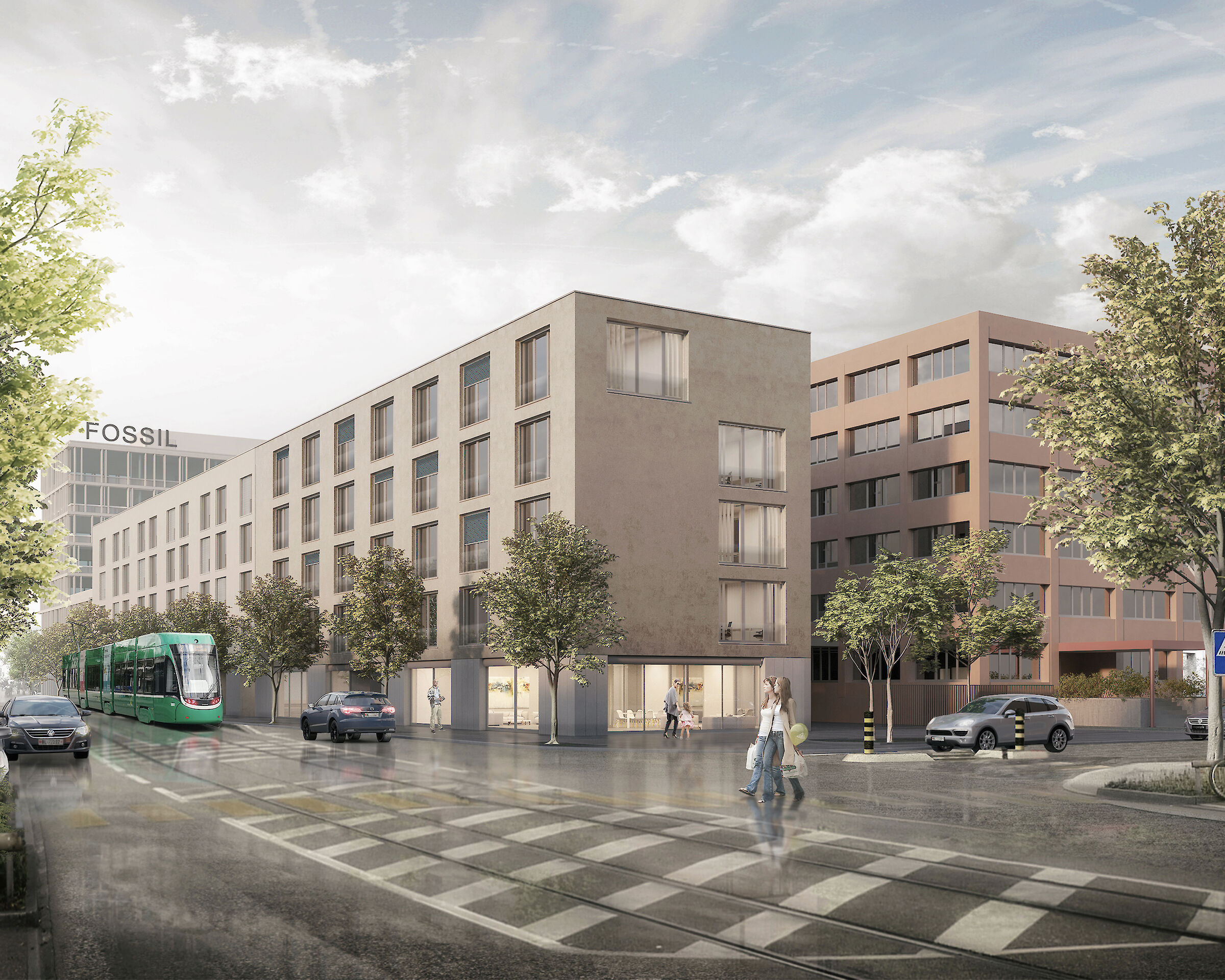 Der Neubau "Riehenring A" liegt im Norden von Basel auf dem Areal des ehemaligen Güterbahnhofs der Deutschen Bahn und ergänzt die geschlossene Bauform des Bebauungsplanes am Riehenring zusammen mit dem Projekt Riehenring B/C sowie dem Projekt Fossil.