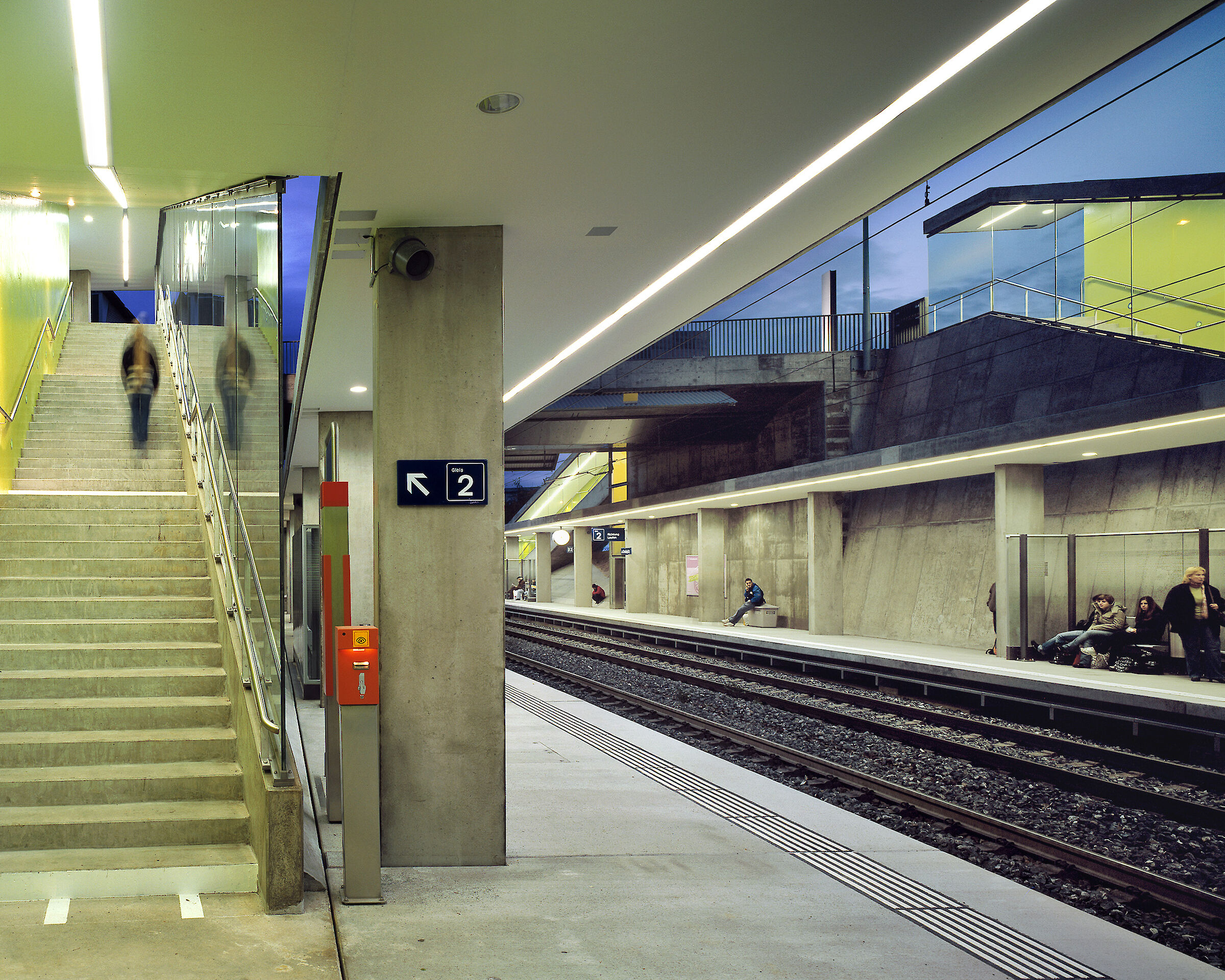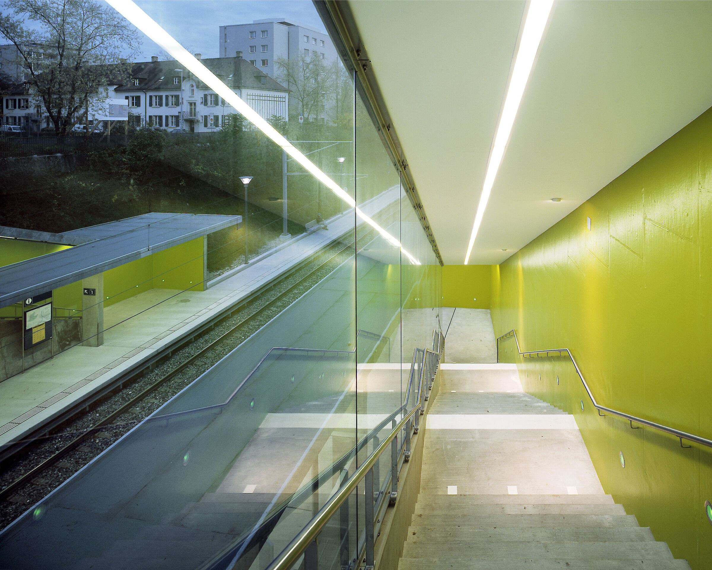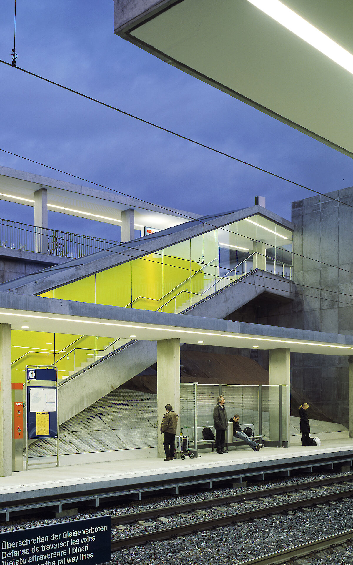Die Bahnlinie Basel-Laufen-Delsberg liegt im Bereich der Haltestelle Dreispitz in einem tiefen Einschnitt, der von einer Strassenbrücke überspannt wird. Eine Situation, wie sie typisch ist für städtische Verhältnisse. Die Verbindung der beiden Verkehrsebenen erfolgt über vier Treppen und zwei Lifte, die auf der Brücke einen neu definierten Ort im Quartier schaffen. Die markanten Betondächer bilden vom Velounterstand auf der Brücke über die leicht aus der Hauptachse gedrehten Treppen bis hin zu den 65 Meter langen Perrondächern eine Linie. Dadurch scheinen Brücke und Haltestelle miteinander zu verwachsen. Die kräftig grün-gelbe Farbgebung der Innenwände der Treppenhäuser weist unverkennbar den Weg. Insbesondere nachts, wenn die Flächen hell angestrahlt werden.