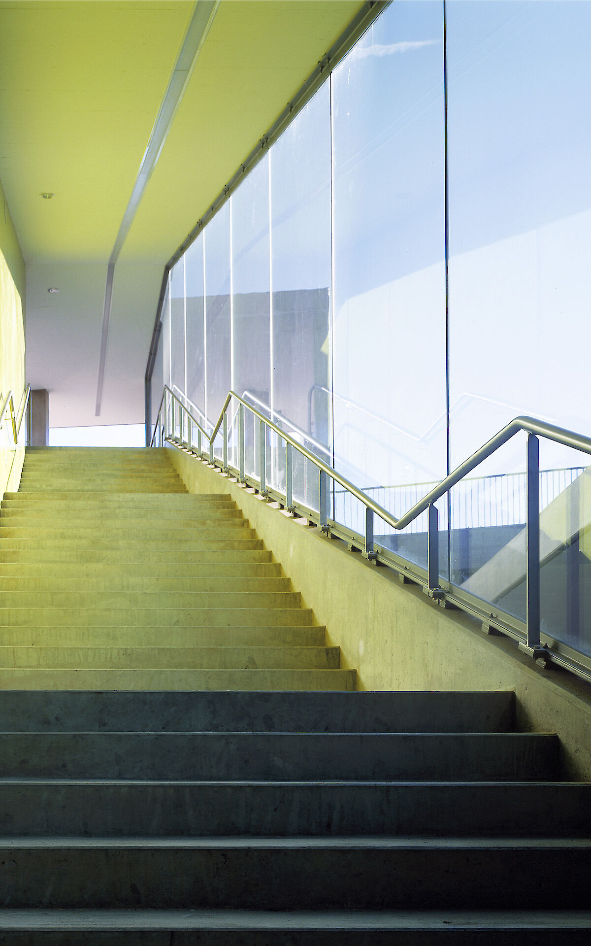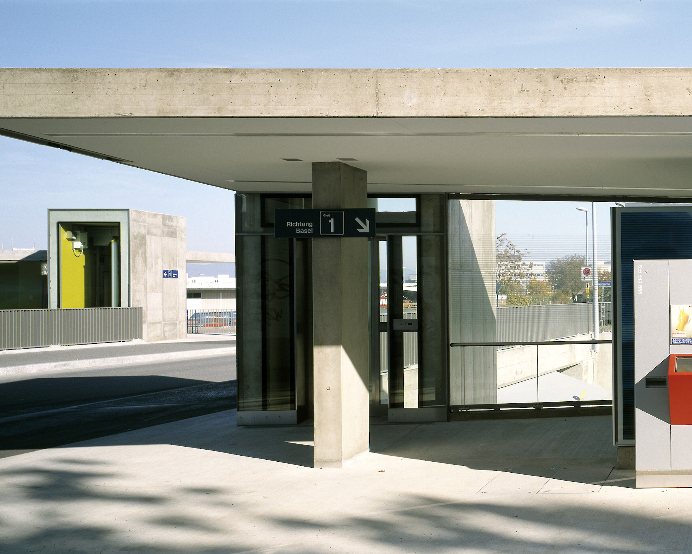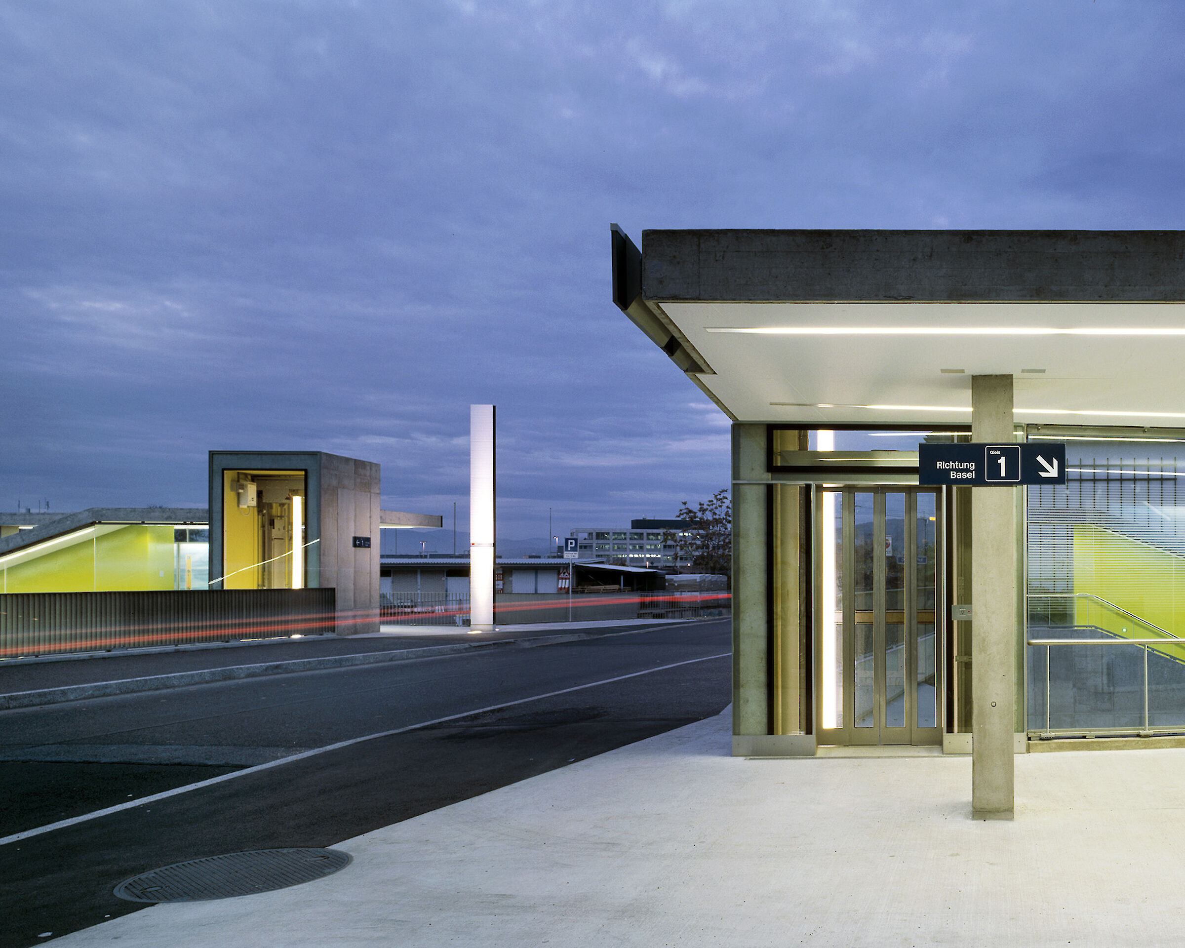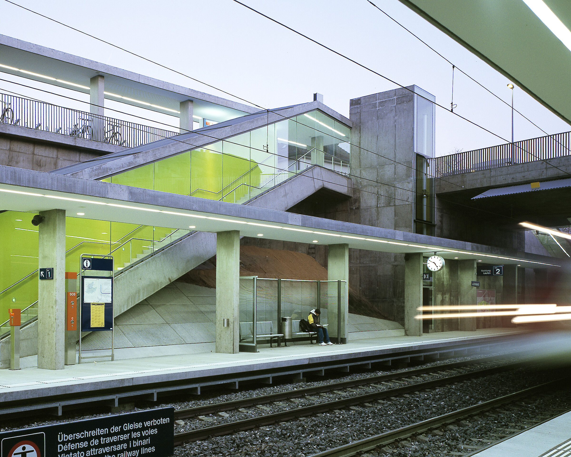 Die Bahnlinie Basel-Laufen-Delsberg liegt im Bereich der Haltestelle Dreispitz in einem tiefen Einschnitt, der von einer Strassenbrücke überspannt wird. Eine Situation, wie sie typisch ist für städtische Verhältnisse. Die Verbindung der beiden Verkehrsebenen erfolgt über vier Treppen und zwei Lifte, die auf der Brücke einen neu definierten Ort im Quartier schaffen. Die markanten Betondächer bilden vom Velounterstand auf der Brücke über die leicht aus der Hauptachse gedrehten Treppen bis hin zu den 65 Meter langen Perrondächern eine Linie. Dadurch scheinen Brücke und Haltestelle miteinander zu verwachsen. Die kräftig grün-gelbe Farbgebung der Innenwände der Treppenhäuser weist unverkennbar den Weg. Insbesondere nachts, wenn die Flächen hell angestrahlt werden.