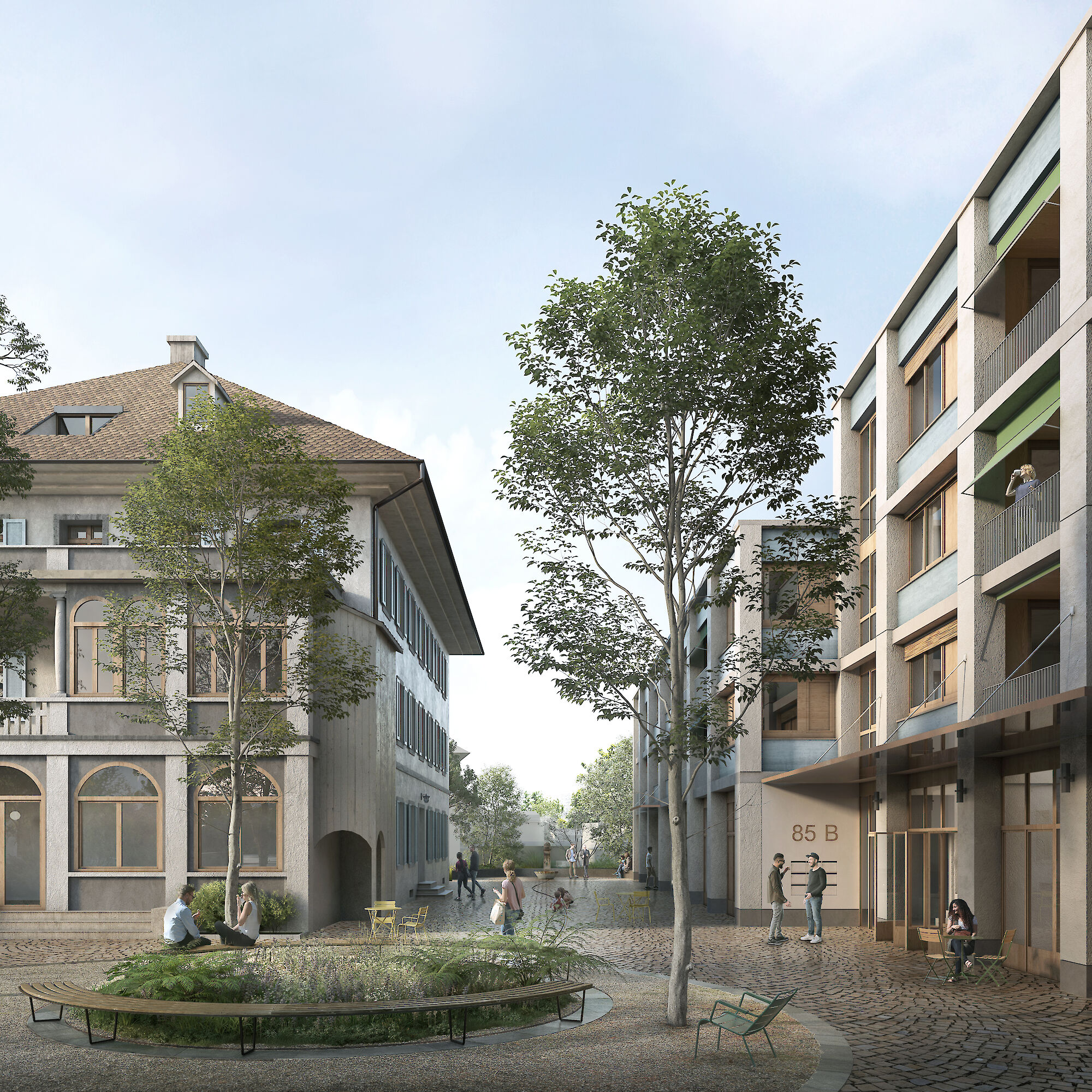 Charakteristisch für die neue Überbauung ist eine differenzierte und sensible Setzung von 2-riegelförmigen Gebäudevolumen mit ähnlichen Proportionen und Abmessungen, die sich im Kontext mit dem Sauerländer-Haus zu einer Quartiersstruktur im öffentlichen Kontext verdichten. Es entstehen offene und gleichzeitig geschützte Gassen und Hofräume, die eine angemessene Abstufung zwischen öffentlichen, halböffentlichen und privaten Aussenräumen ermöglichen. Auch bietet die Orientierung eine optimale Belichtungssituation der Wohnungen.