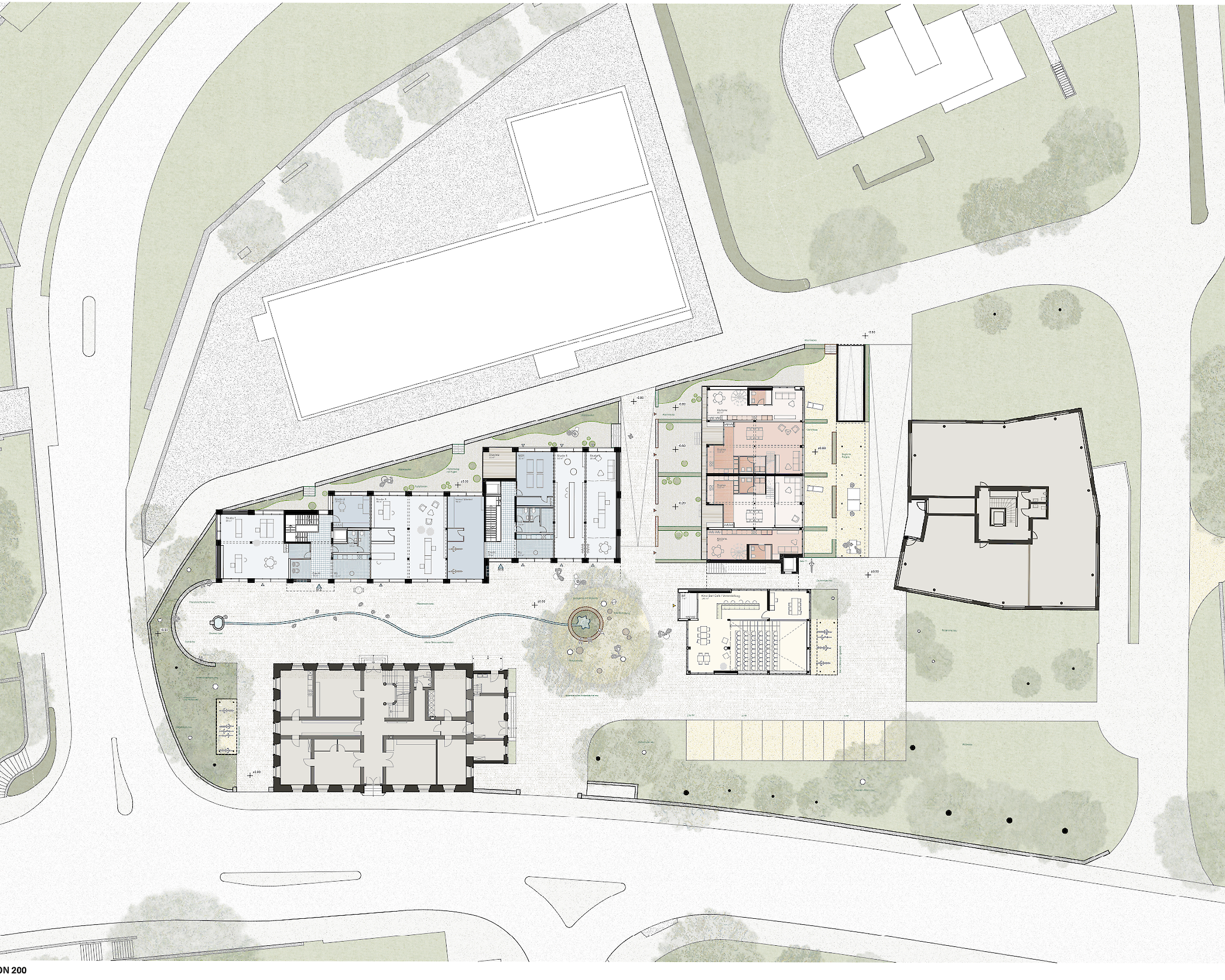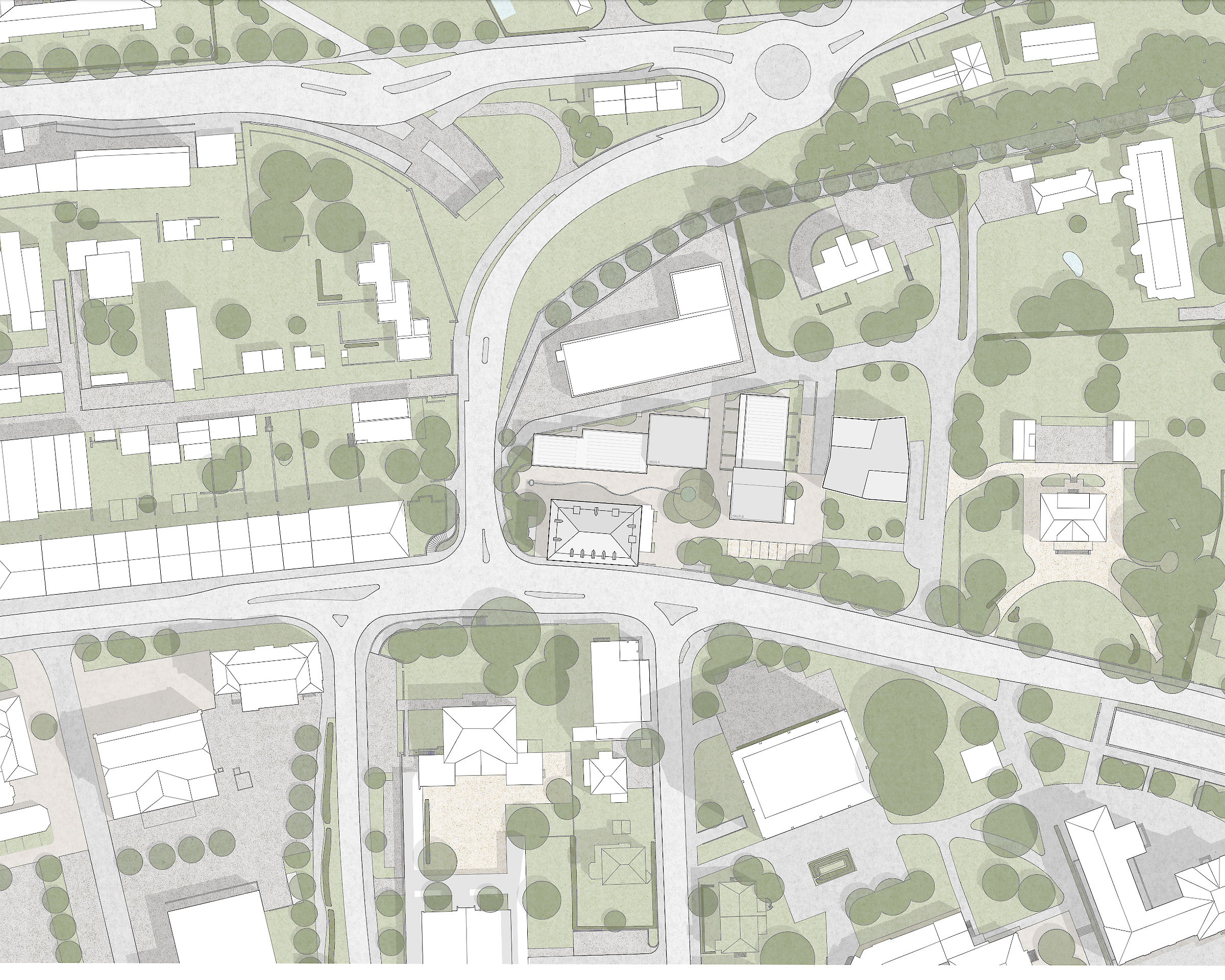 Durch die städtebauliche Disposition wird die bestehende historische Bausubstanz in ihrer Identität nicht beeinträchtigt, sondern volumetrisch selbstverständlich ergänzt. Gleichzeitig wird auch die östliche Bebauung räumlich in den Gesamtkontext eingebunden. Der flankierenden 3–4-geschossige Riegelbau (Gebäude A) im Bereich des ehemaligen Ökonomiegebäudes bildet dabei die bauliche Kulisse für das prägnante Sauerländer-Haus.
