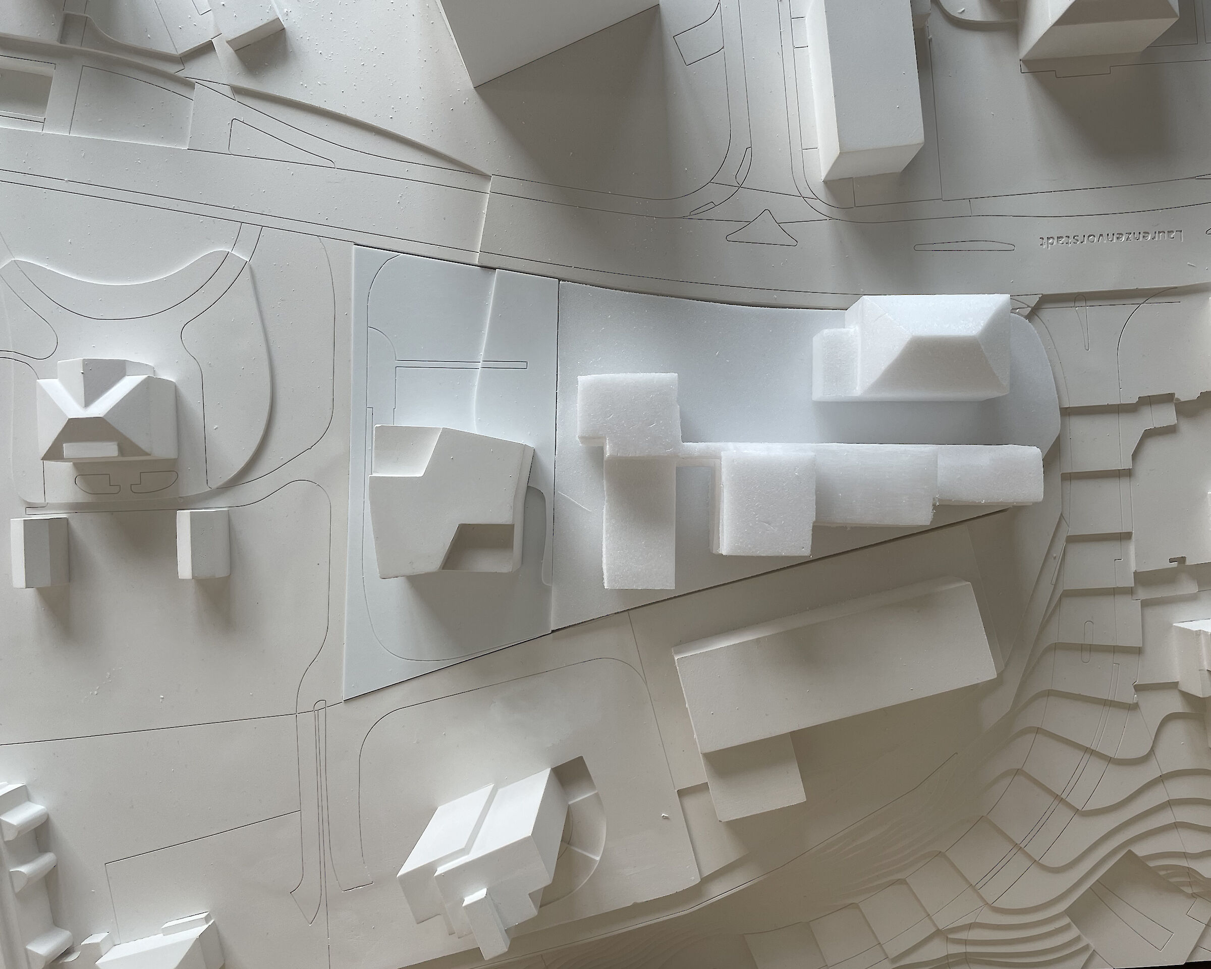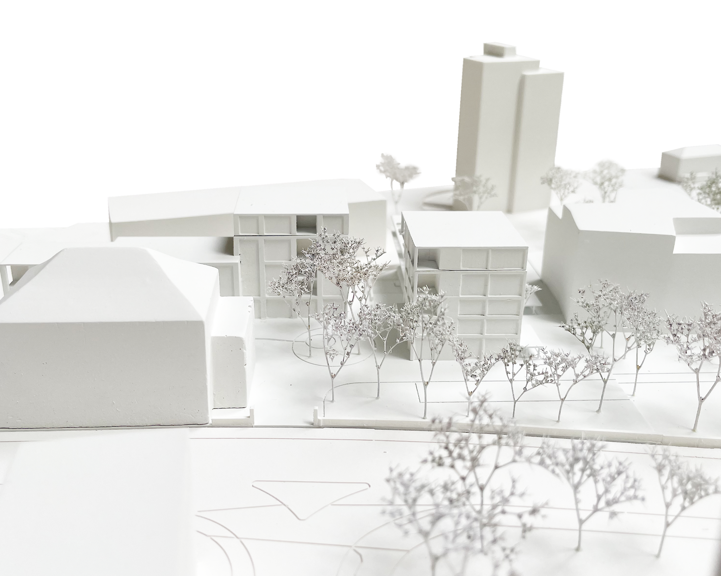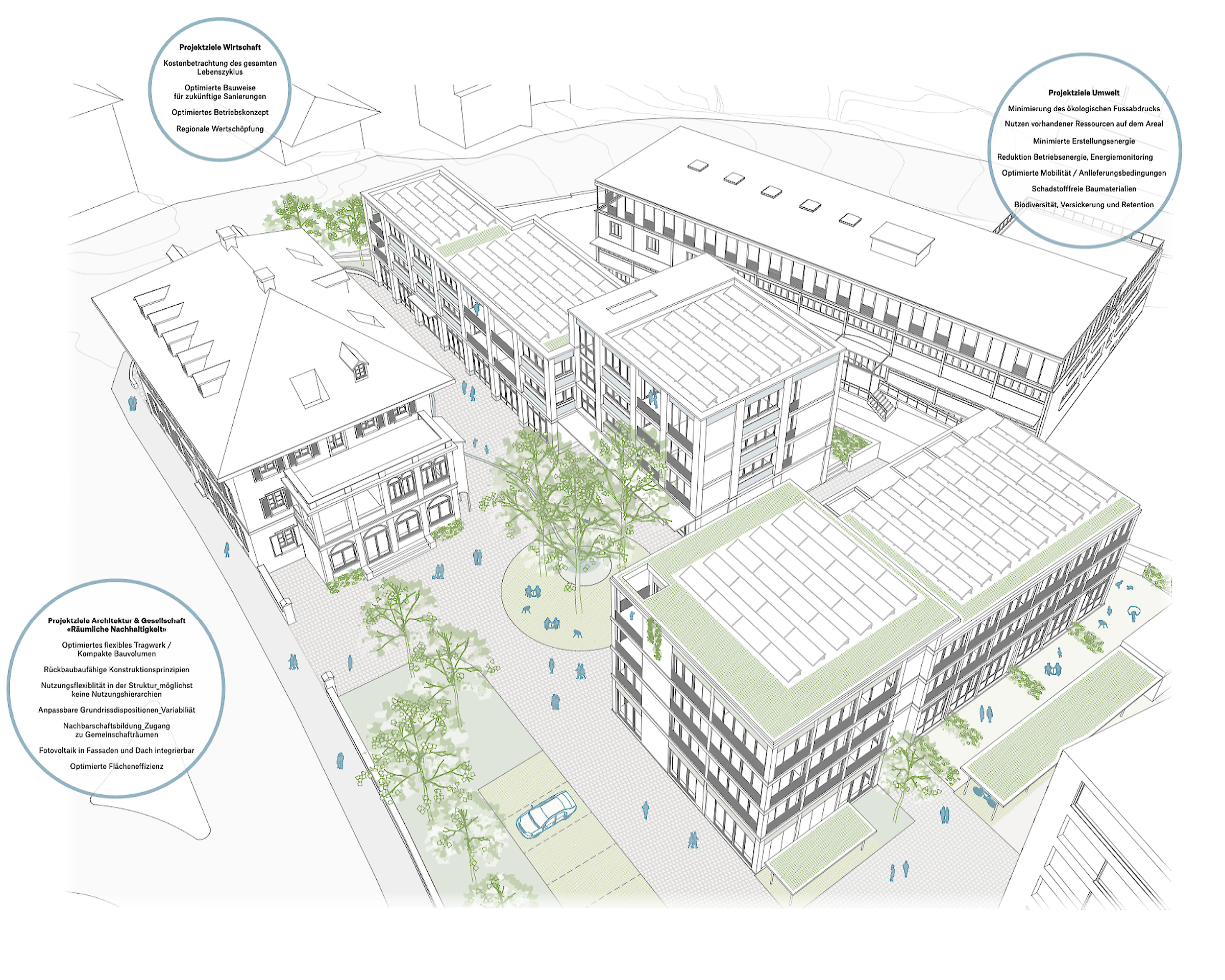Charakteristisch für die neue Überbauung ist eine differenzierte und sensible Setzung von 2-riegelförmigen Gebäudevolumen mit ähnlichen Proportionen und Abmessungen, die sich im Kontext mit dem Sauerländer-Haus zu einer Quartiersstruktur im öffentlichen Kontext verdichten. Es entstehen offene und gleichzeitig geschützte Gassen und Hofräume, die eine angemessene Abstufung zwischen öffentlichen, halböffentlichen und privaten Aussenräumen ermöglichen. Auch bietet die Orientierung eine optimale Belichtungssituation der Wohnungen.