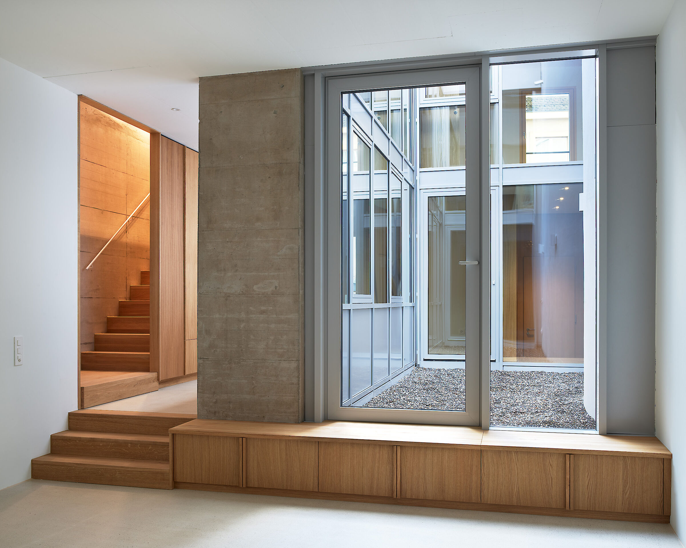 Das bestehende Kino wird zu drei separat erschlossenen Townhouses umgenutzt, die als zusammenhängendes, eigenständiges Volumen im Strassenzug abgebildet werden. Die Wohn- und Arbeitsräume gruppieren sich auf unterschiedlichen Niveaus um einen zentralen Innenhof. Dieser ermöglicht trotz der einseitigen Ausrichtung des grossen, geschlossenen Bestandsvolumens eine adäquate Belichtung und entschärft die unmittelbare Nähe zum öffentlichen Raum durch die Orientierung ins Innere. Es entstehen Raumzonen mit differenzierten Sicht- und Aussenraumbezügen.