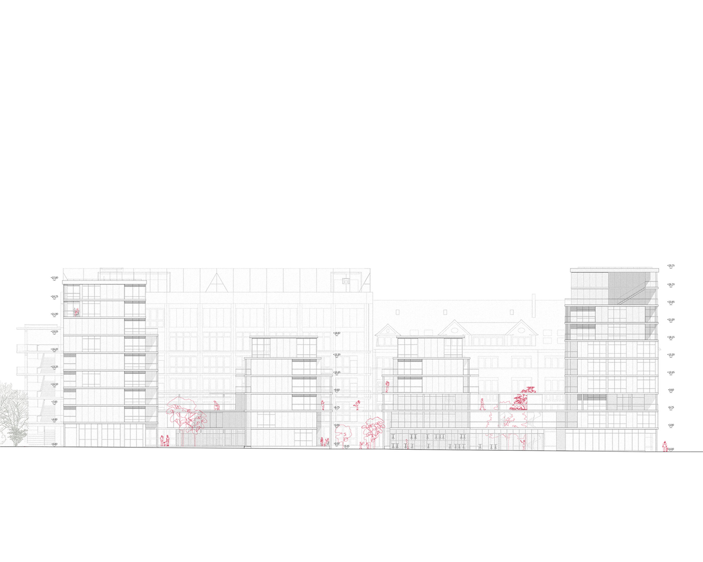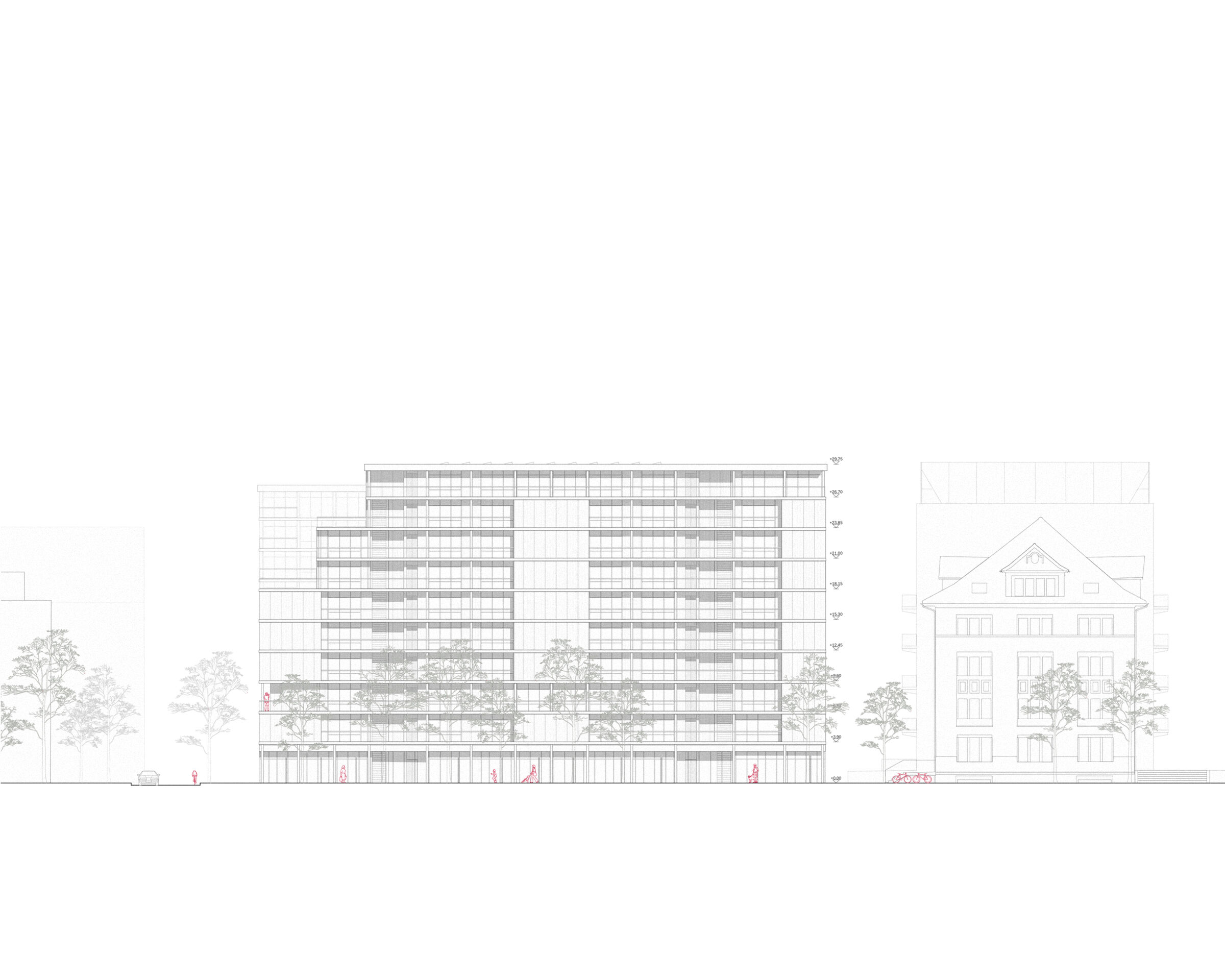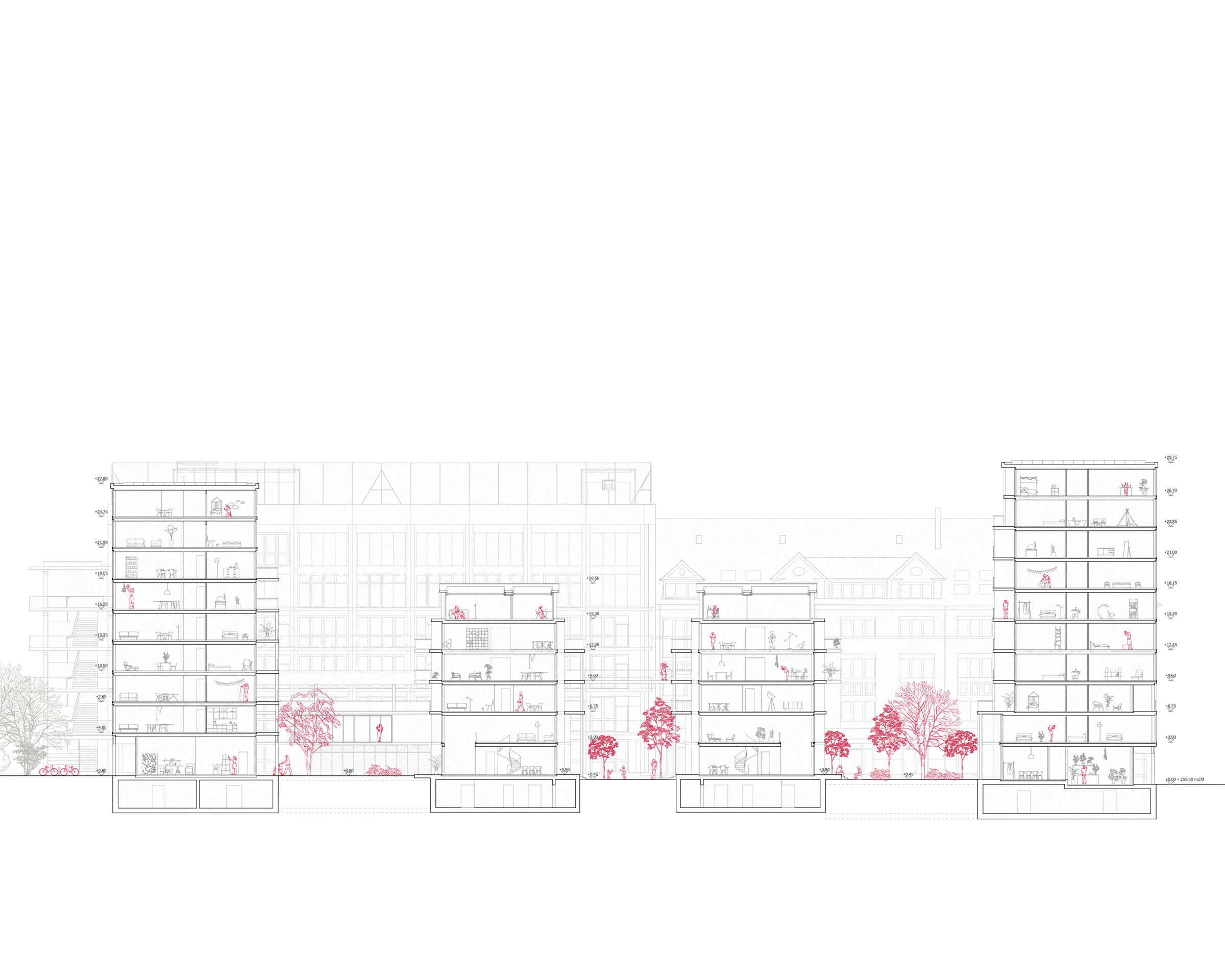Die flankierenden neun- bis zehngeschossigen Riegelbauten bilden Auftakt und Abschluss des Quartiers und gleichzeitig eine bauliche Massnahme gegen die Lärmbelastung der Elsässerstrasse. Die vorgeschlagene Bebauungsstruktur formuliert ausserdem vielfältige, aneignungsfähige Wohnmodelle für eine urbane, diversifizierte Stadtgesellschaft.