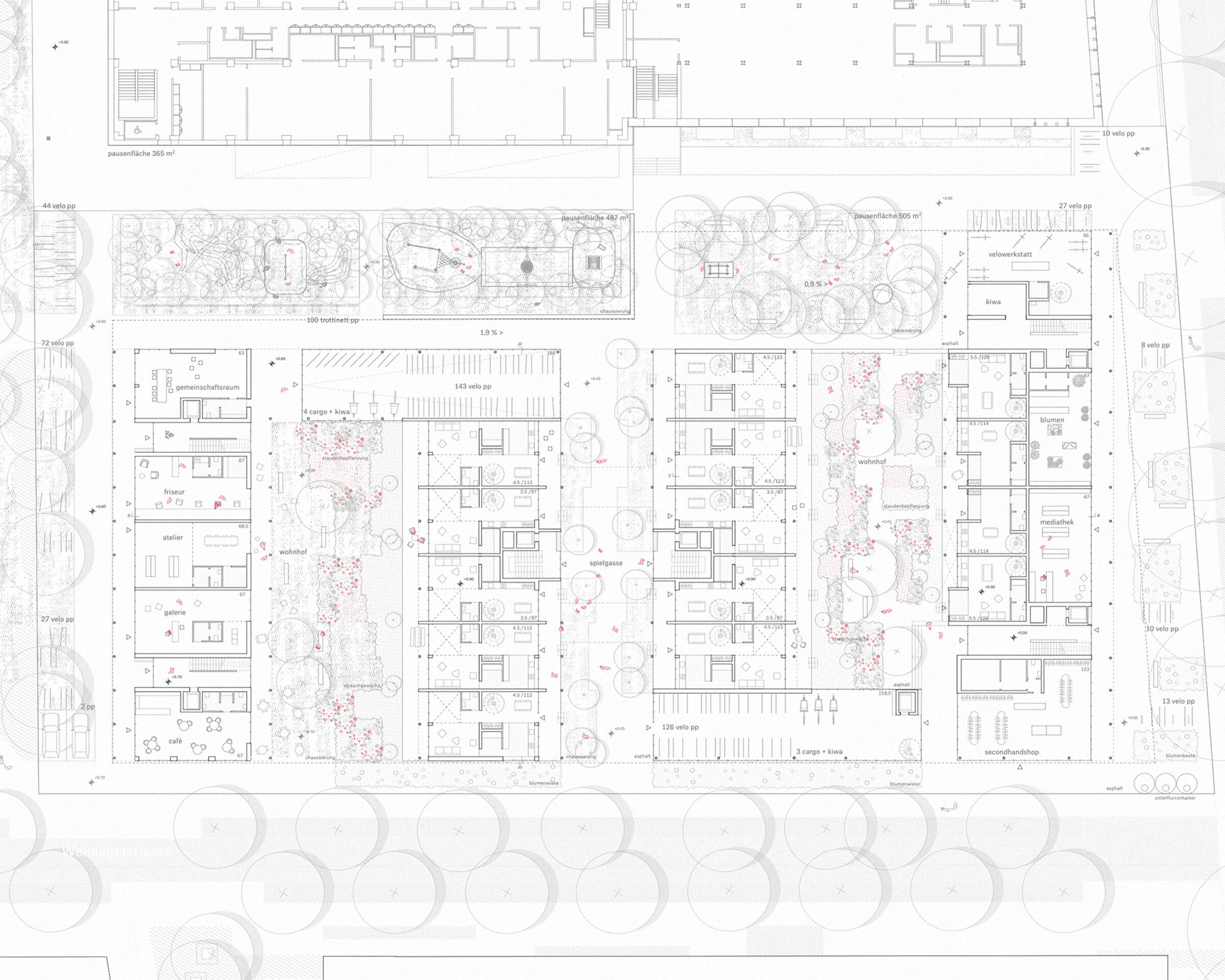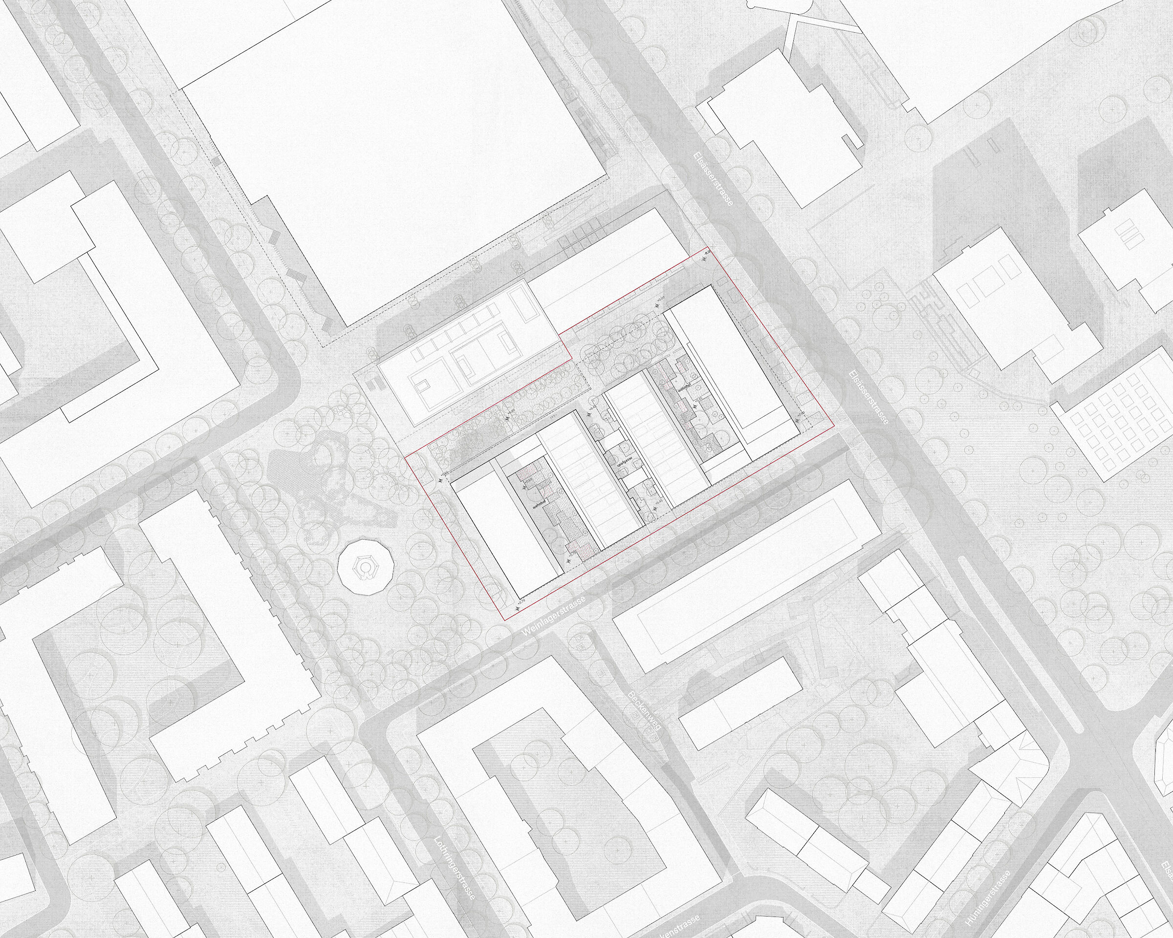 Die parallele Anordnung von Doppelzeilen schafft, im Gegensatz zu einer Blockrandbebauung, kein starres Gegenüber. Vielmehr wird eine stadträumliche Durchlässigkeit zwischen Weinlagerstrasse und Schulgebäude formuliert.