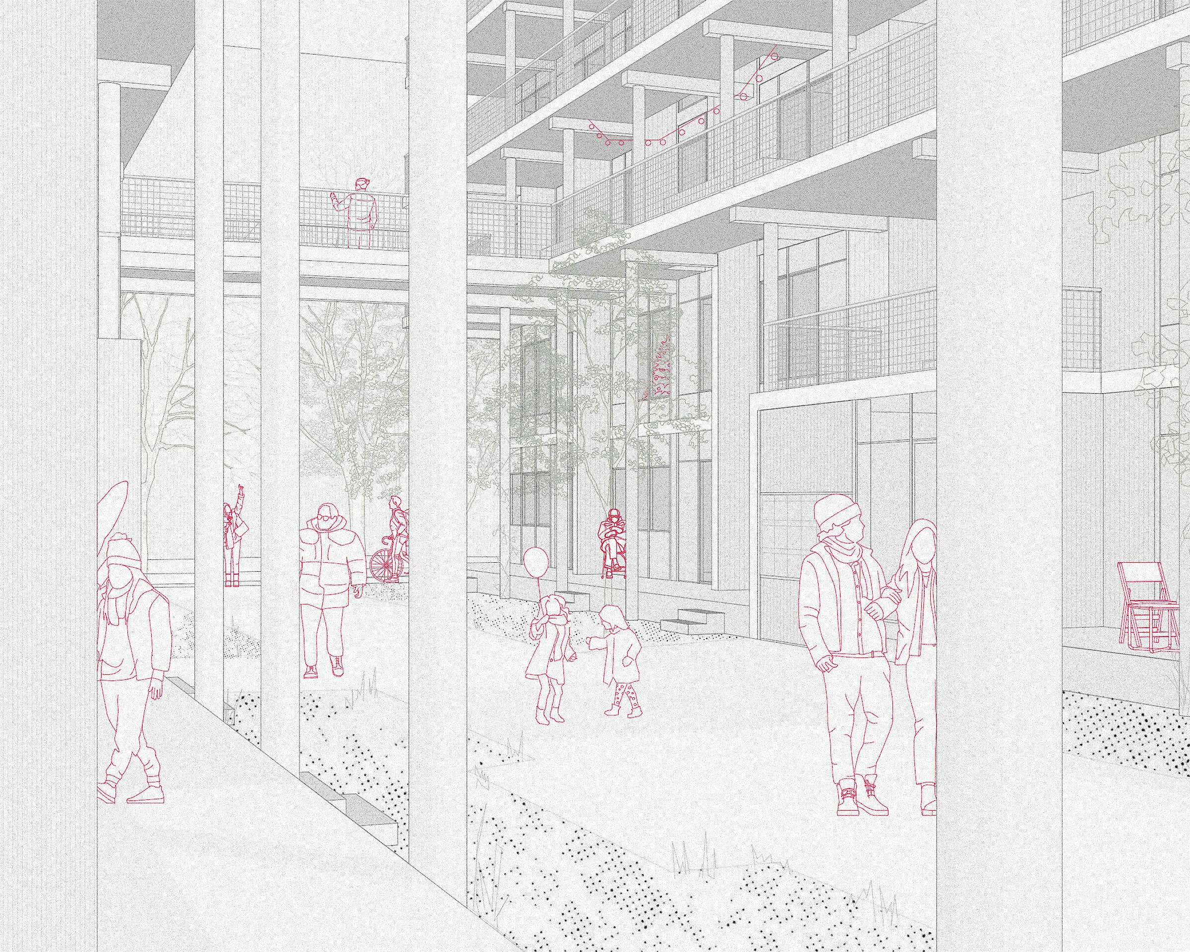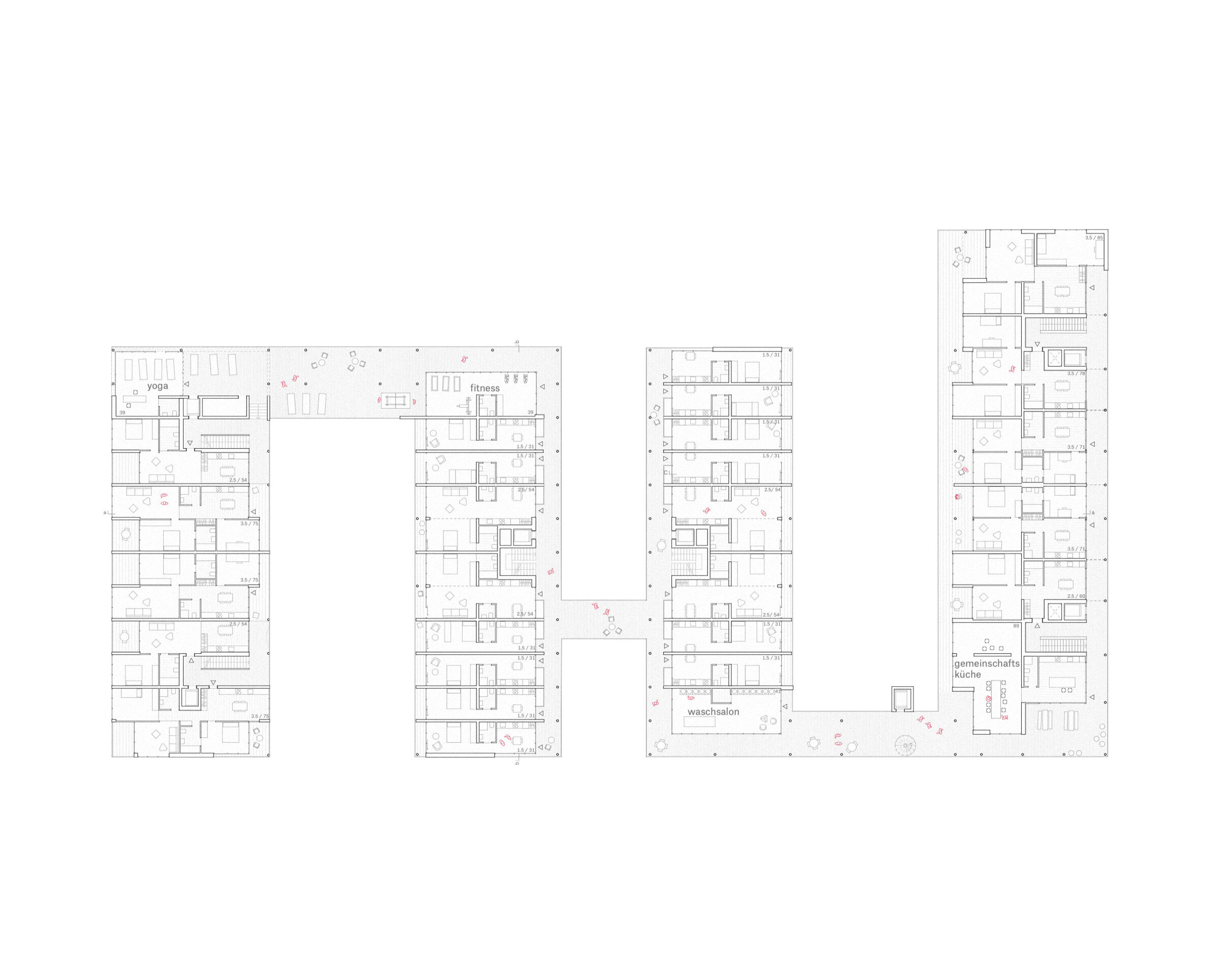Es entstehen introvertierte Hofräume, die eine angemessene Abstufung zwischen öffentlichen, halböffentlichen und privaten Aussenräumen generieren. Diese städtebauliche Disposition ermöglicht, EG-Wohnen im Quartierskontext umzusetzen.