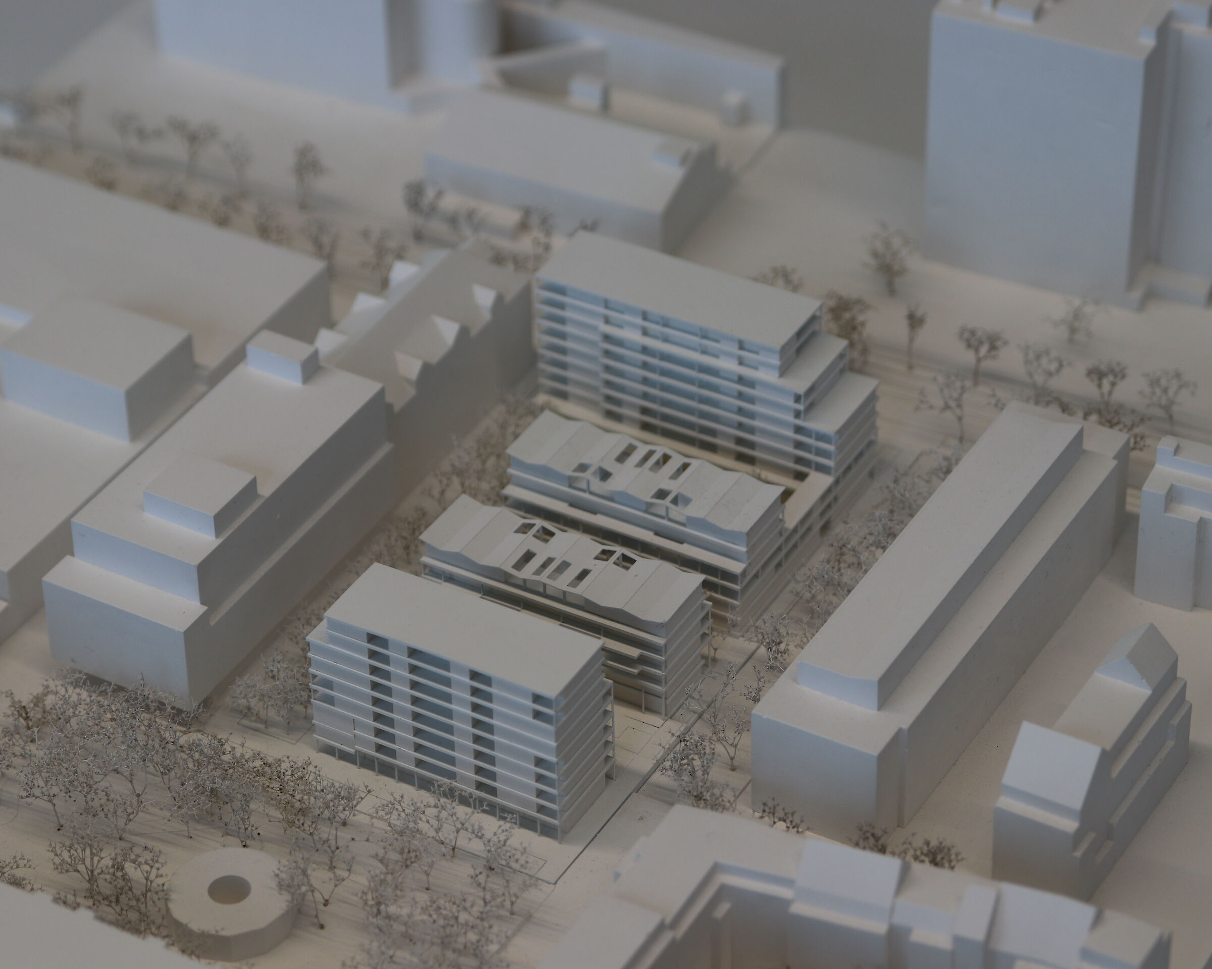 Charakteristisch für die neue Überbauung ist eine präzise Setzung von vier riegelförmigen Gebäudevolumen mit unterschiedlichen Proportionen und Abmessungen, die sich zu einer Quartierstruktur im urbanen Kontext verdichten.